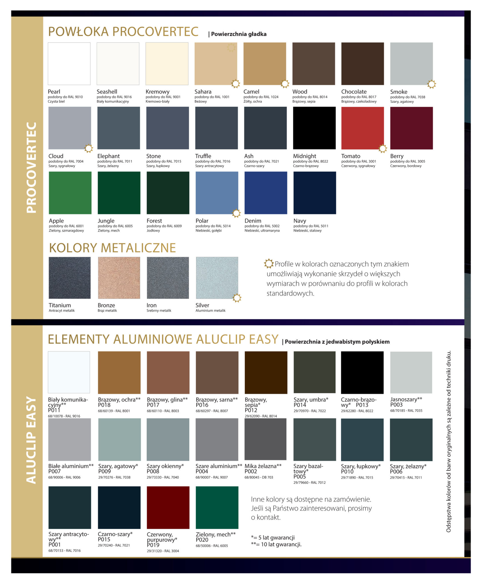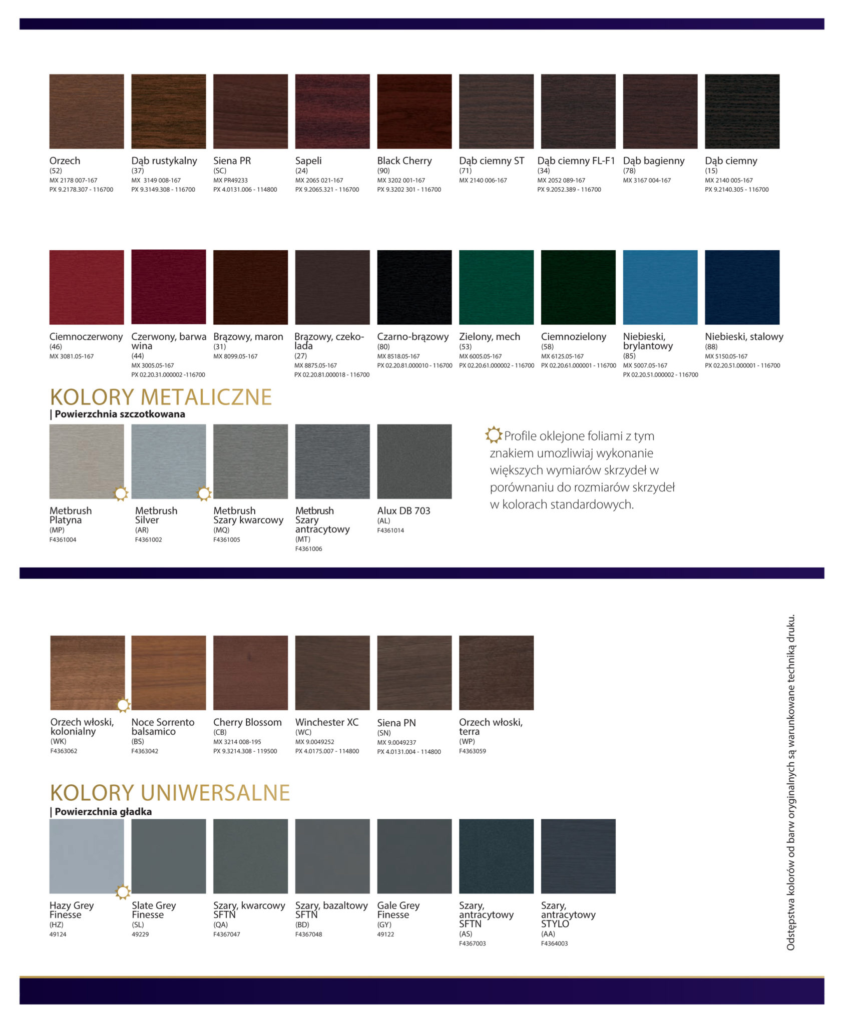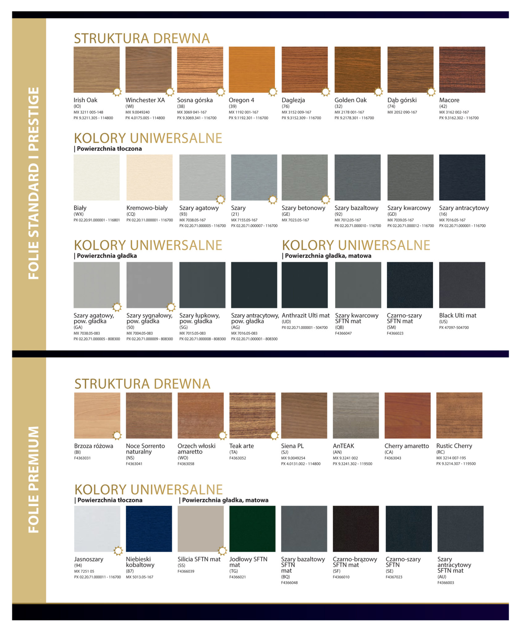 Paleta kolorów obejmuje niespełna 80 dekorów. Mają Państwo wybór pomiędzy modnymi jednolitymi kolorami, naturalnymi strukturami drewna i eleganckimi metalicznymi odcieniami. W naszej ofercie znajdą Państwo również, odpowiadający aktualnym trendom kolor szary i jego odcienie, a także gładkie i szczotkowane powierzchnie, które uzupełniają klasycznie tłoczone struktury folii.